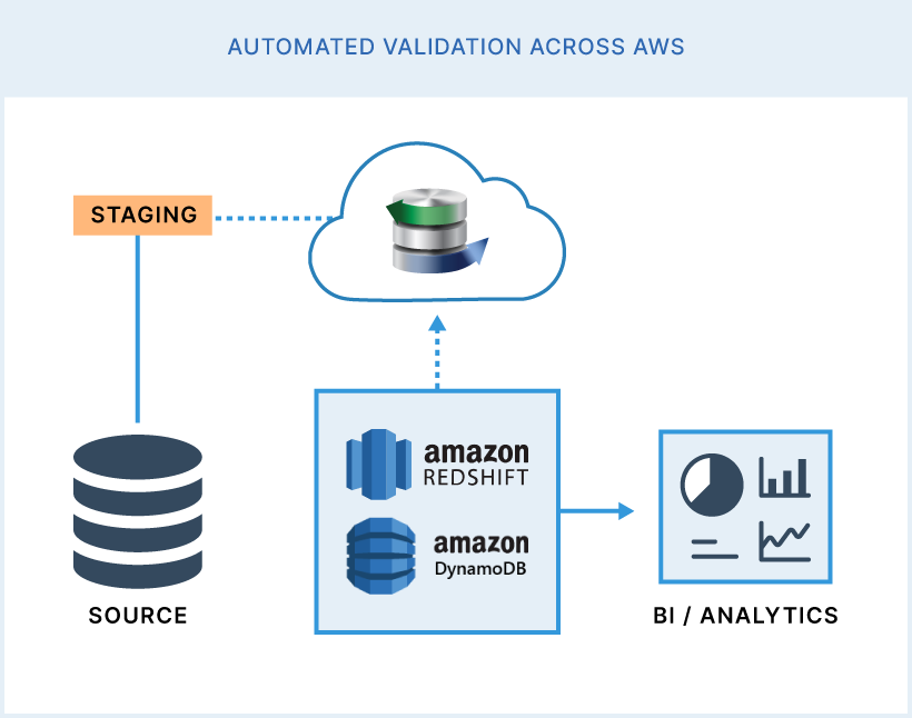 QuerySurge solves this by providing continuous, automated validation across AWS services, comparing data from sources to Redshift and DynamoDB targets, and validating downstream analytics in BI platforms.