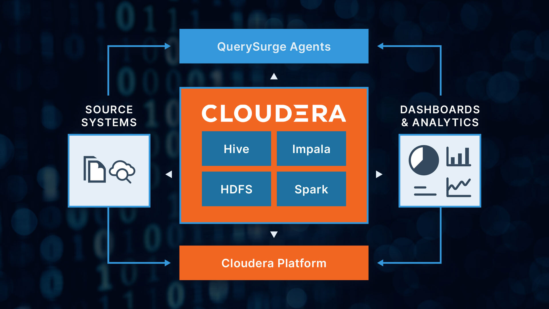 QuerySurge connects to Hive, Impala, HDFS, HBase, Kafka outputs, Parquet files, ORC files, and more. This gives you end-to-end validation across every data source and processing layer you run on Cloudera.