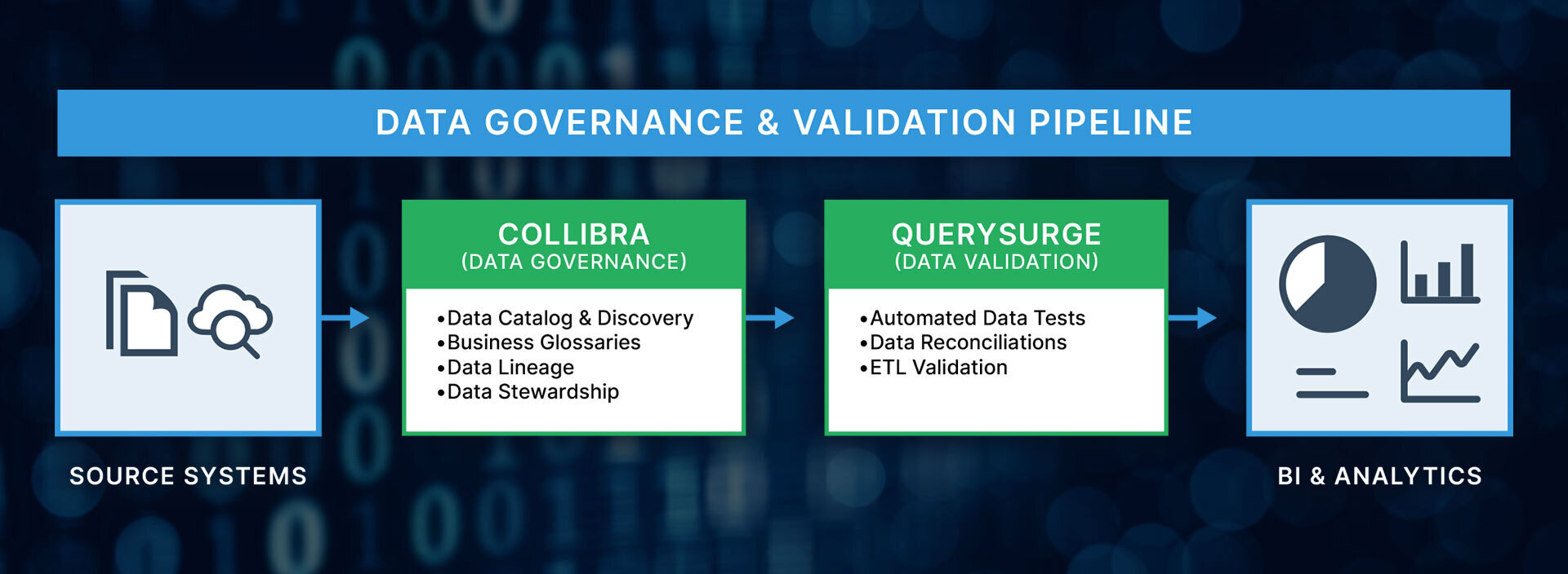 Collibra and QuerySurge address different but tightly connected parts of the data trust problem. Together, they help organizations move from documented data quality expectations to continuously validated data in production.