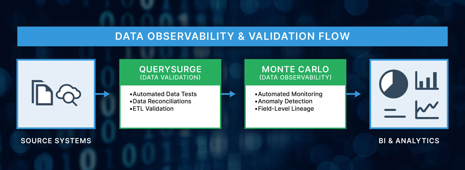 Monte Carlo and QuerySurge address different but complementary layers of data reliability. Used together, they give you both continuous observability and deterministic validation across the data lifecycle.