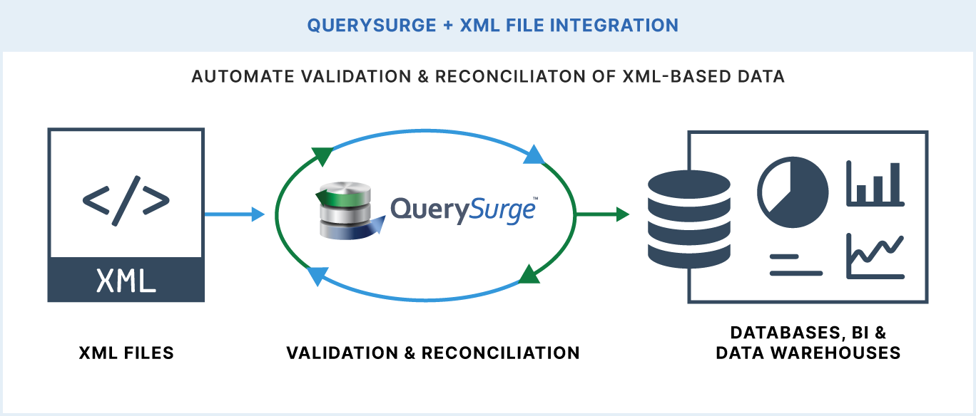 QuerySurge integrates directly with XML files to automate validation, reconciliation, and audit-ready reporting at scale.